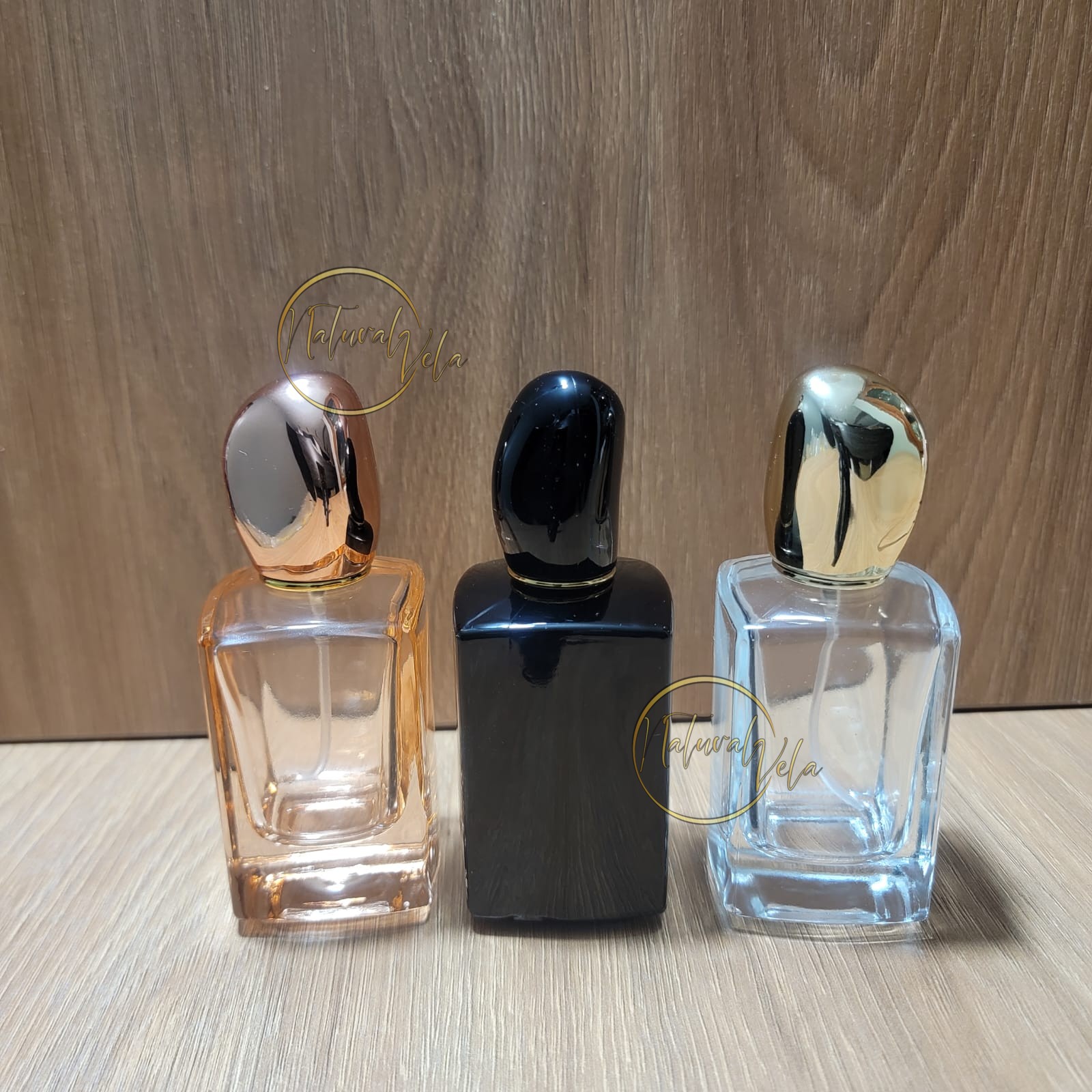 Envases de vidrio transparente, aptos para perfumería, con atomizador.